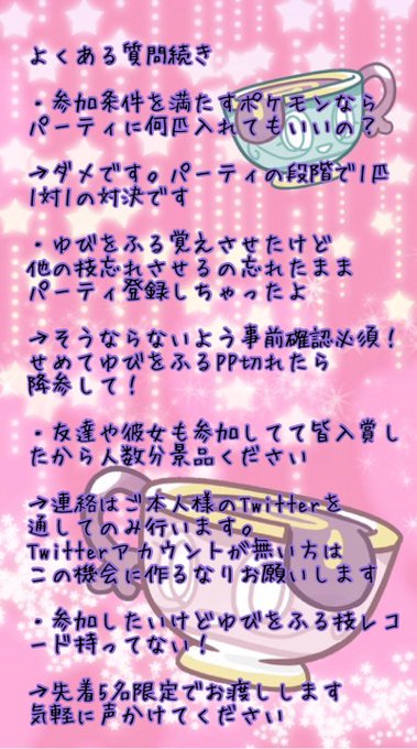 〇大会データ 〇日時 〇大会idについて 〇ルール説明 〇各枠のポケモン 〇ルール説明に則った具体的なパーティ 〇景品について 〇景品の内容 〇景品の応募方法 〇景品の応募方法に則った具体例ツイート 〇大会の当日の流れ 〇Q&a 〇あとがき どうもまっつ~です! 仲間大会の告知をさせていただきます! 日時 ㈫ PM 21時~ ㈪ またも急遽の変更誠に申し訳ございません。 ルール 弱点ダメ杯~ が弱点、 禁止~ ( には同じタイプが入る)